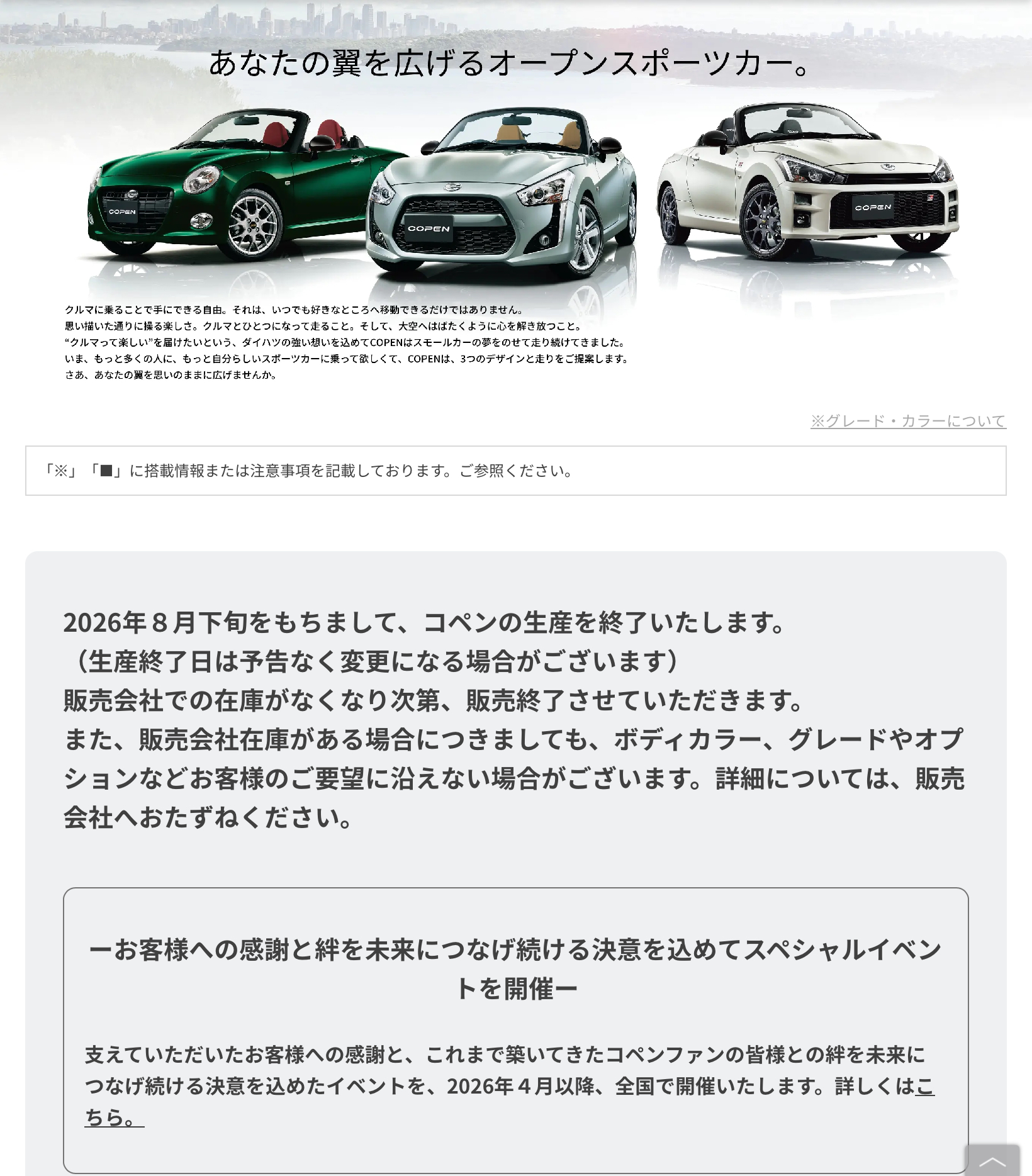 ダイハツは、現行コペンの全モデルについて、2026年8月下旬をもって生産を終了すると発表しました(情報源:公開された画像に記載の日付)。生産終了日は予告なく変更される可能性があるため、最新情報は販売会社に問い合わせる必要があります。