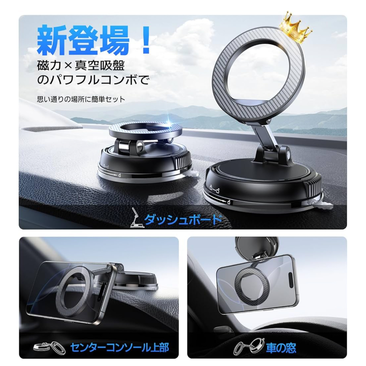 しかも真空吸盤と強力磁石のW固定で、軽スポーツカー特有の揺れでもしっかりホールド。見た目も高級感があり、キャンプギアの一部としても優秀かもしれません。